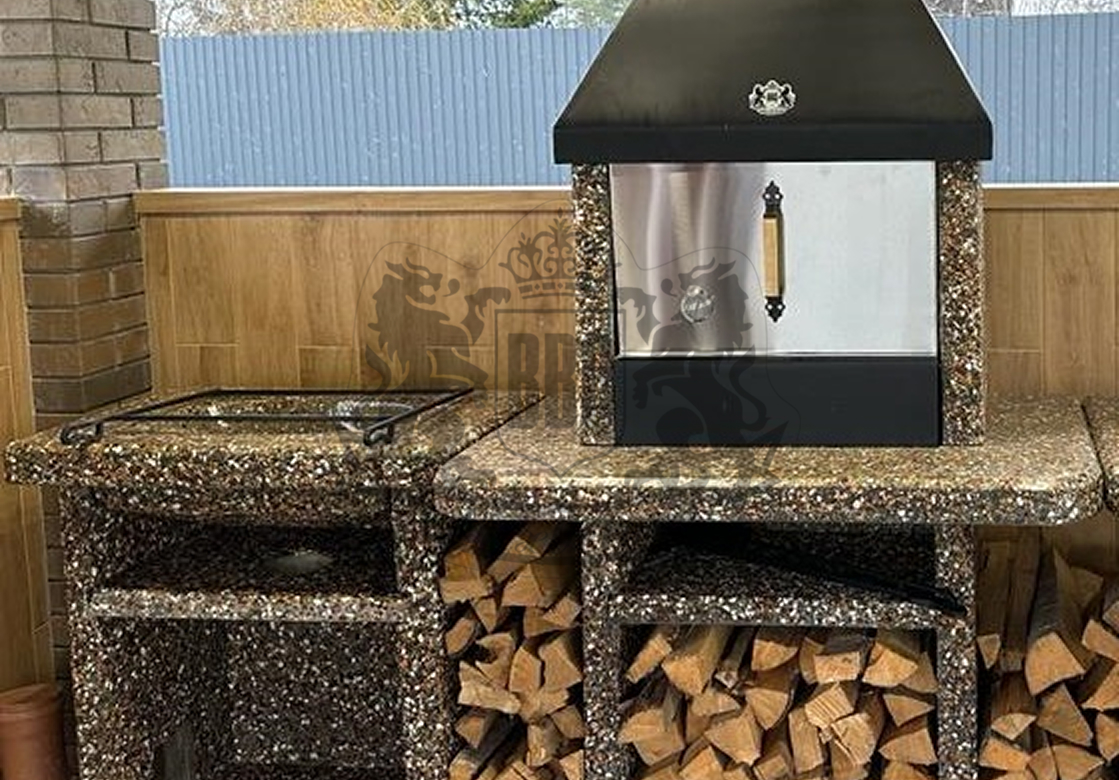 Барбекю-комплекс с русской печкой — это вершина модульной кухни от производителя «ЛюксБетон», сочетающая мангал, печь под казан и главный элемент — русскую печь. Такая конструкция позволяет не только жарить шашлыки, но и запекать, томить блюда, выпекать хлеб, воссоздавая вкус еды из традиционной деревенской печи. Это полноценная уличная кухня, которая заменит вам летнюю кухню или беседку.
